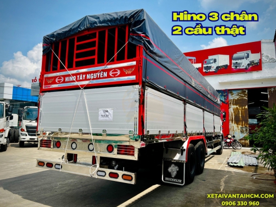 Xe tải Hino 3 chân 2 cầu thật thùng mui bạt nhôm thiết kế đà I thùng dài 9m4